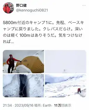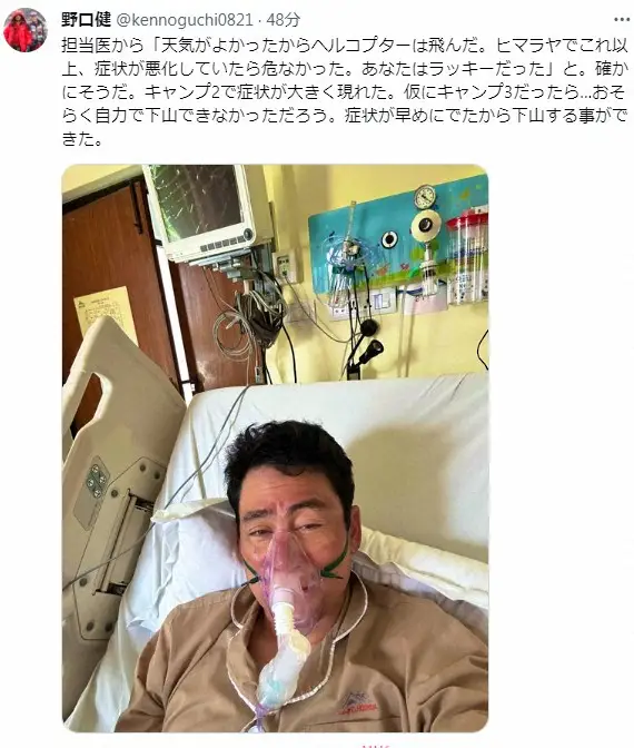 だが21日、野口氏のSNSが事務所によって更新され、「昨日、C2に行き、ベースキャンプに戻る途中に呼吸困難となり、血中酸素濃度53%になってしまいました。酸素吸入を行い、登山隊同行医師に診てもらいましたが、肺水腫かもしれないとの事で、ヘリにてカトマンズにおり、病院にて診察してもらっています」と、ヘリコプターで救急搬送されたと報告した。