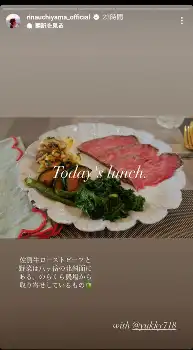 内山はローストビーフや野菜が彩り良く盛り付けられた写真を投稿。「Today's lunch.」として「佐賀牛ローストビーフと野菜は八ケ岳の北斜面にある、のらくら農場から取り寄せしているもの」と説明を添えた。