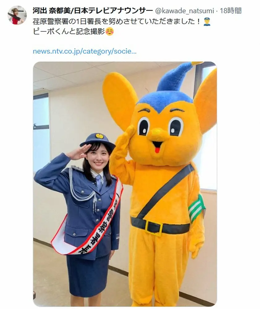 日本テレビの河出奈都美アナウンサー(27)が25日までに自身のXを更新。一日警察署長の制服姿を披露した。