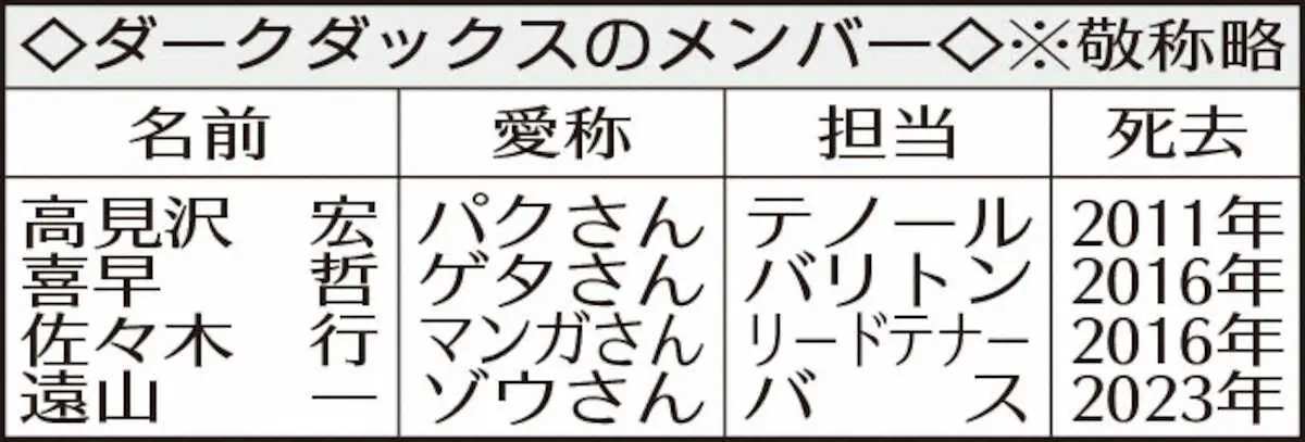 男性コーラスグループのダークダックスの(左から)高見沢宏さん、佐々木行さん、喜早哲さん、遠山一さんの4人が合唱する 「ダークダックス」遠山一さん死去 93歳 男性コーラスグループ草分け、4… ギャラリーで見る この記事のフォト 2023年09月26日の画像一覧 もっと見る 2023年09月26日の画像をもっと見る