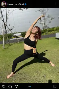 「ヨガ終わりにコンブチャクレンズ(昆布茶じゃないよw)飲みやすくて最近のお気に入り 乳酸菌、ビフィズス菌、植物発酵エキス、、、からだにいい菌がたくさん入ってるの!」とつづり、ブラトップ&レギンス姿でのヨガポーズをとっている写真などをアップ。