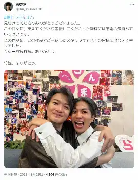 神木と抱き合う姿を投稿し、「この作品に、この作品でご一緒したスタッフキャストの皆様に出会えて幸せでした。りゅーお疲れ様。ありがとう。竹雄。ありがとう」と記した。