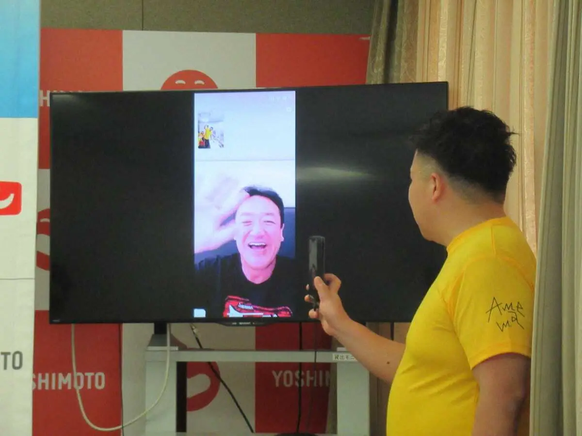 会見場に設置された大型画面にたむらが現れると、久々に寛平や石田靖(57)、サバンナ・八木真澄(49)、麒麟・田村裕(44)、福本愛菜(30)らの顔が写り、声が聞こえるとたむらは満面に笑み。会話中も笑いっぱなしだった。緊急帰国が決まると、西代は強制的に電話を終了。笑いを誘った。