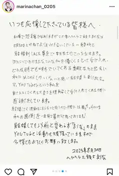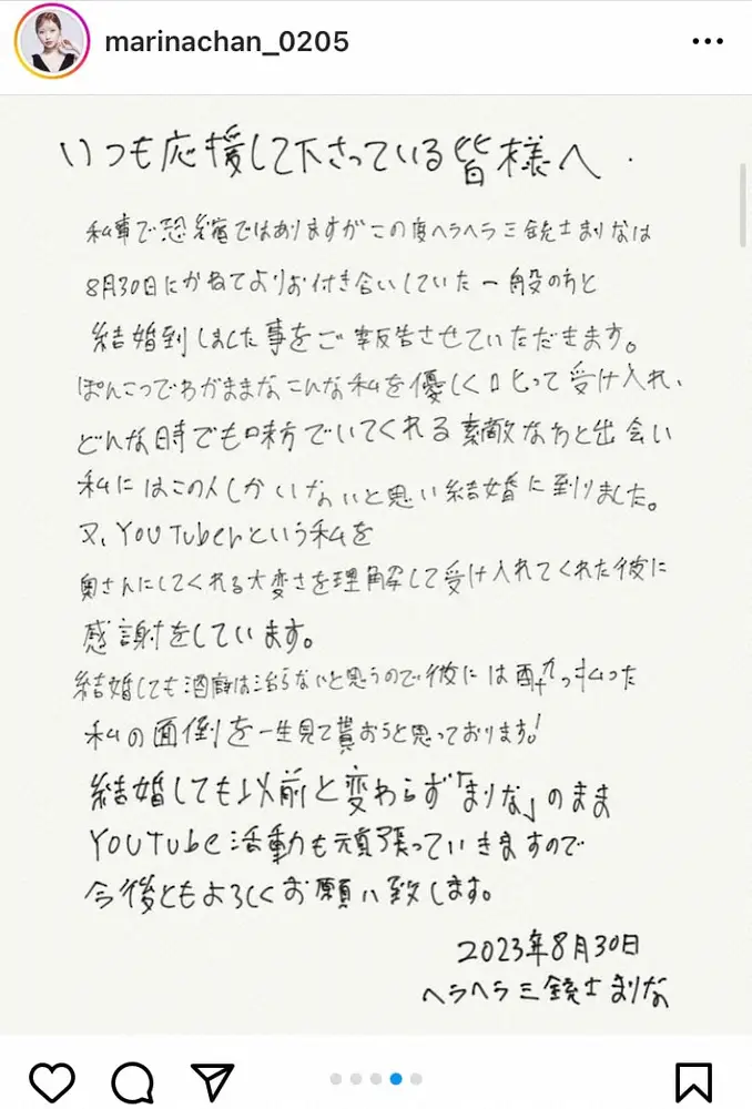 まりなは8月30日に一般男性との結婚を発表。「ぽんこつでわがままなこんな私を優しく叱って受け入れ、どんな時でも味方でいてくれる素敵な方と出会い私にはこの人しかいないと思い結婚に到りました(原文ママ)」などと、SNSに直筆メッセージを投稿していた。