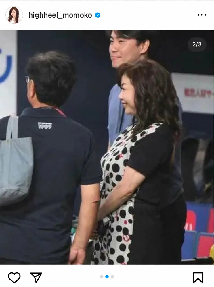 画像をよく見てみると、背面が黒地のワンピースを着たモモコと隣にいる毎日放送・三ツ廣政輝アナウンサーの黒いズボンが同化。境目がわからず、モモコが倍ほどの体型に見えてしまう奇跡的な?ショットになってしまった。