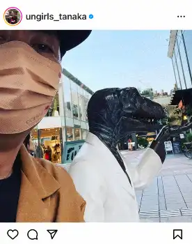田中は「隣に恐竜います!」とのみつづり、1枚の写真を投稿。街中で、白衣のようなジャケットを着る“恐竜”がマスクをした自身の隣で歩く姿が収められており、何ともシュールなショットになっている。