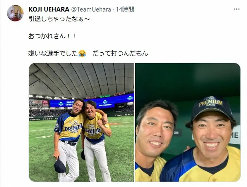 上原氏は「引退しちゃったなぁ~」と書き出すと、「サントリードリームマッチ」でのユニホーム姿の2ショットをアップ。「おつかれさん!!嫌いな選手でした だって打つんだもん」とねぎらい、称えた。