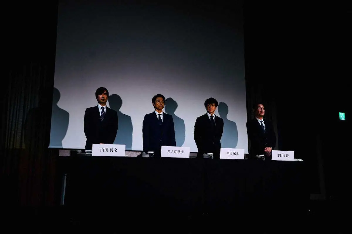 <ジャニーズ事務所会見>会見に臨む井ノ原快彦(左から2人目)と東山紀之ら(撮影・会津 智海)