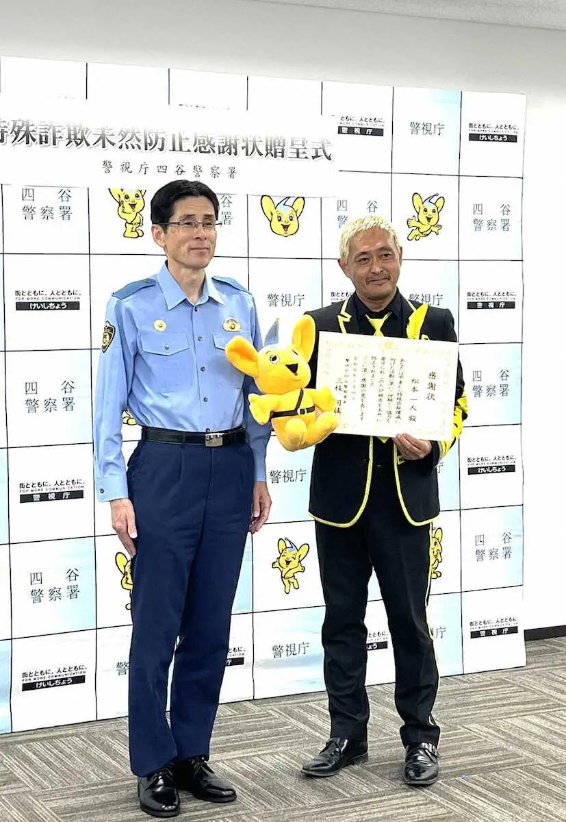 ダウンタウンの松本人志(60)のそっくりさんとして活動するタレント・松本一人(56)が、特殊詐欺の被害を未然に防いだとして4日、警視庁四谷署から感謝状を贈られた。贈呈式に臨んだ松本は「人として当たり前のことをしただけで、注目されてキツネにつままれたようです」と照れ笑いだった。