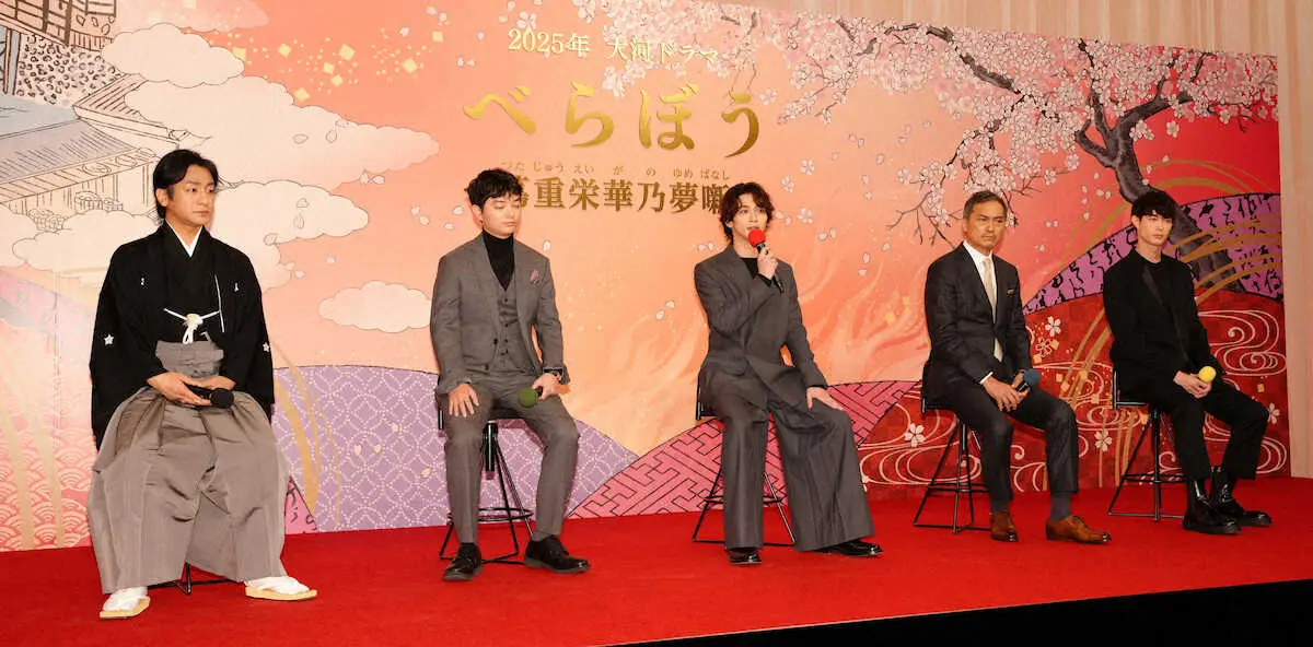 <大河ドラマ「べらぼう」出演者発表会>新キャストに決まった(左から)片岡愛之助、染谷将太、横浜流星、渡辺謙、宮沢氷魚(撮影・西尾大助)