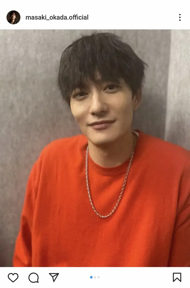 「初めまして、岡田将生です。Instagram始めました」と書き出すと、オレンジのセーターにネックレス姿のショットをアップ。