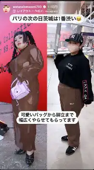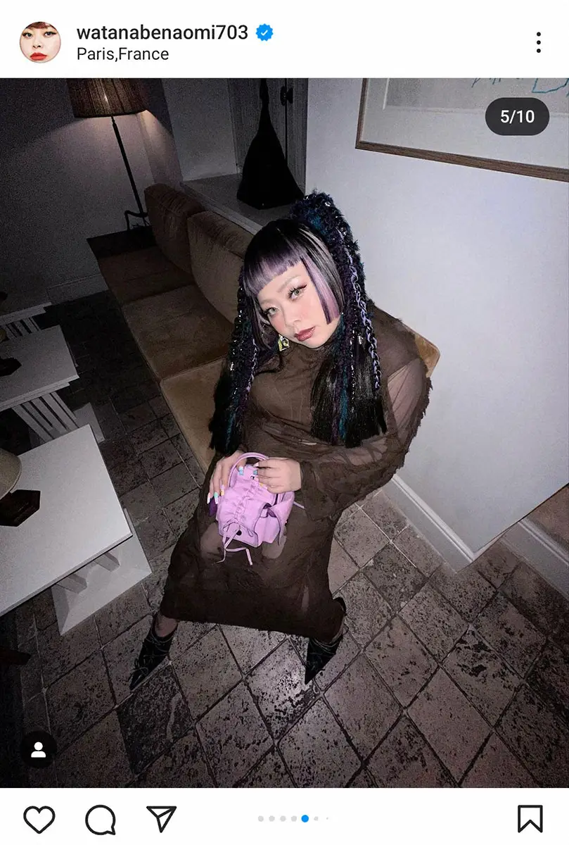 パリではバッチリ決めたメークとヘアスタイルでワンピースドレスを着たショットが話題に。渡辺はこの日「パリの次の日茨城は1番渋い」とつづり、ピンクのミニバッグを持ったパリバ―ションの姿と脚立を担いだ姿を投稿し「可愛いバッグから脚立まで幅広くやらせてもらってます」と