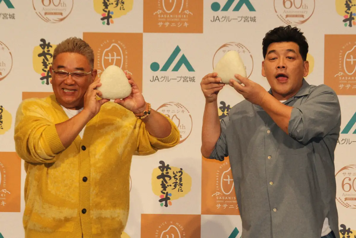 お笑いコンビ「サンドウィッチマン」の伊達みきお(49)と富澤たけし(49)が6日、都内で行われた令和5年産宮城米の新CM発表会に出席。ラグビー日本代表にエールを送る場面があった。