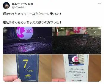 屋敷は、「何かめっちゃラッキーなタクシーに乗れた! 運転手さんもめっちゃええ感じの方やった!」と報告。5千分の7と書かれたカードなどの写真を掲載し、日本交通株式会社の「幸運のタクシー」に乗車できたことを報告した。