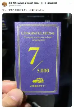 同社の公式サイトによると、「幸運のタクシー」とは、東京都内を走る5千台のうち、7台だけ存在する「超激レアなタクシー」。乗車すると記念乗車証がもらえるという。