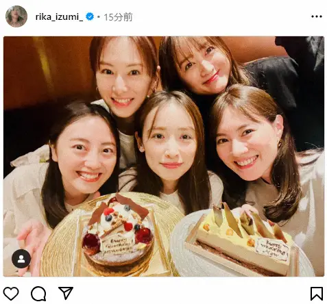 「大好きなみんなと出会えて20年 いつもありがとう」と添え、5人でケーキを囲んだ集合ショットをアップ。バースデーケーキには10月23日に誕生日を迎える沢井、11日に誕生日を迎える泉の名前が、結婚を祝うケーキには9月に結婚を発表した安座間の名前が入っていた。