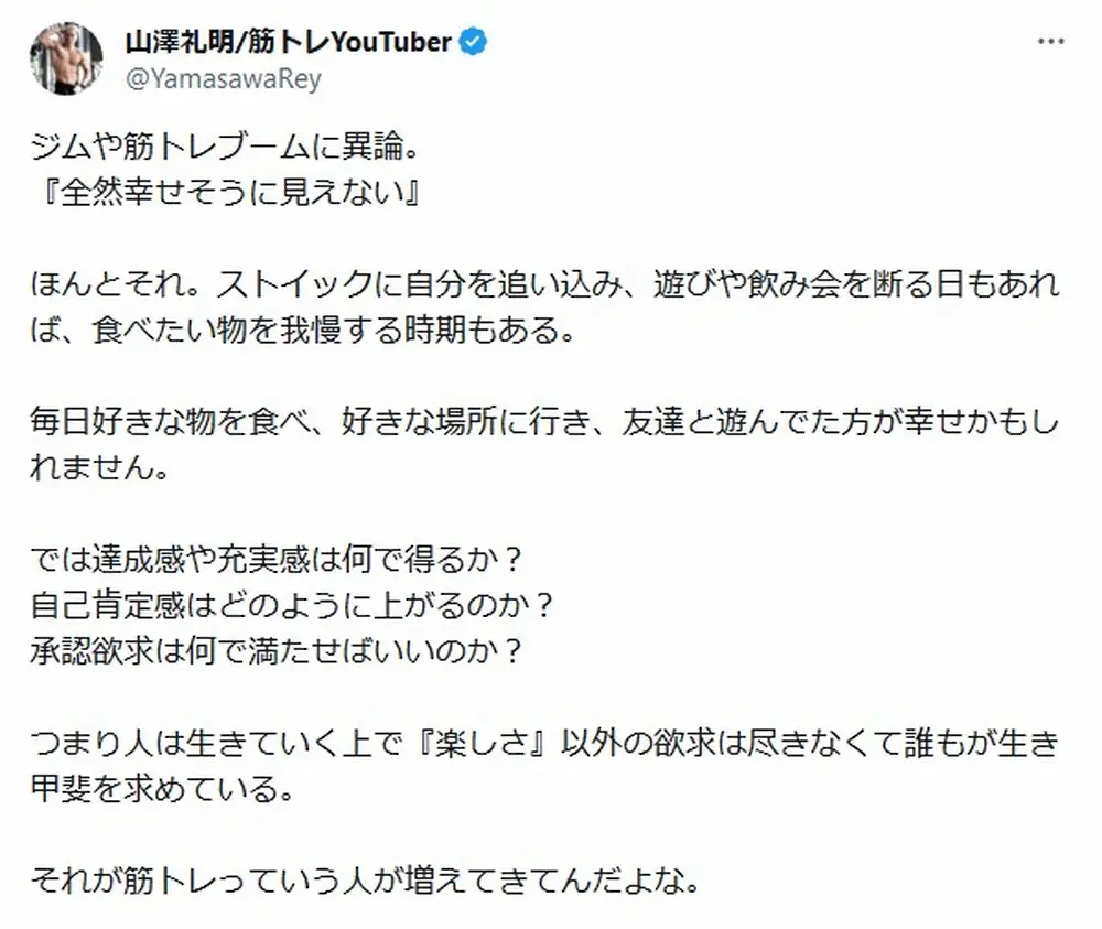 山澤礼明のインスタグラム(@rey.yamasawa)より 山澤礼明 筋トレは“全然幸せそうに見えない”に持論「生きがいを求めてる… ギャラリーで見る この記事のフォト 2023年10月11日の画像一覧 もっと見る 2023年10月11日の画像をもっと見る