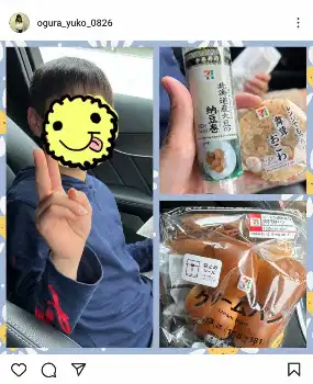 小倉は、「週末のお昼ご飯」とコメント。「バタバタしていたので、コンビニで好きな物を選んで車でご飯を食べてもらいました!!」と、購入した商品などの写真を掲載した。
