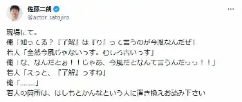 佐藤は、「現場にて」と投稿。「知ってる?『了解』は『り』って言うのが今風なんだぜ」という佐藤に対し、"若人"が「全然今風じゃないっす。むしろ古いっす」と答えたという。