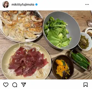 藤本は「夜ご飯」と書き出すと、皿に盛られたカツオの刺身や餃子をはじめとする夕食の写真をアップ。