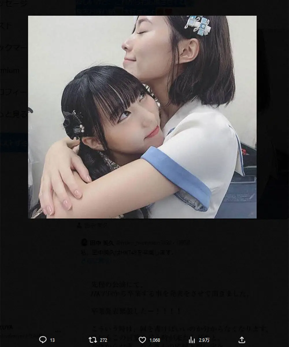 松井珠理奈 Photo by スポニチ 松井珠理奈 グループ卒業発表したHKT48・田中美久へ「お姉ちゃんのように… ギャラリーで見る この記事のフォト 2023年10月12日の画像一覧 もっと見る 2023年10月12日の画像をもっと見る