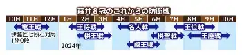 8冠となった藤井にはこれから怒濤(どとう)の防衛戦ロードが待ち受けている。既に伊藤を挑戦者に迎えた竜王戦の防衛戦が始まっており、6、7日に行われた第1局で勝利を収めている。1月には王将戦が予定されており、現在行われている挑戦者決定リーグの優勝者を迎え撃つ。その後も、棋王戦、名人戦、叡王戦、棋聖戦、王位戦、王座戦と続いていく。