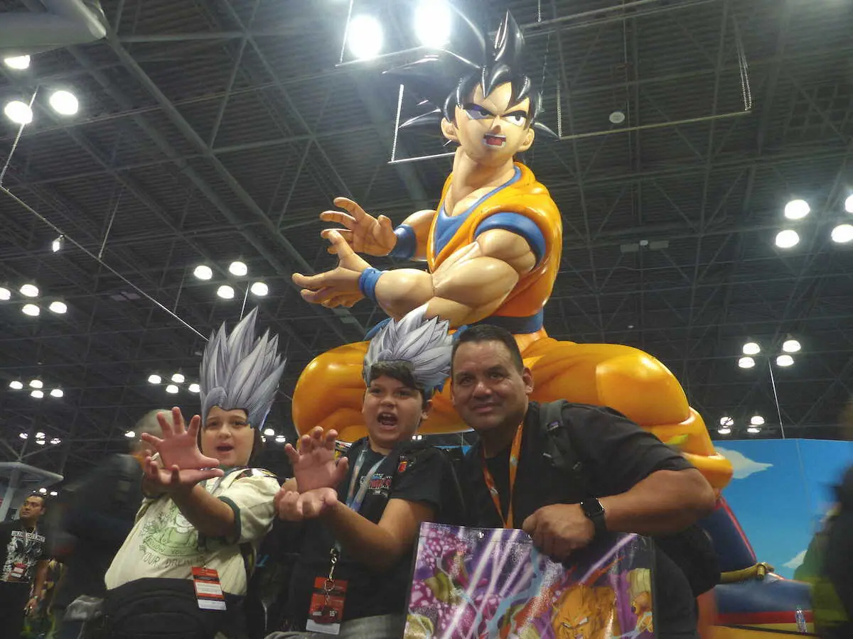 ドラゴンボールブース内に展示された孫悟空の巨大オブジェの前でポーズを決める海外ファン