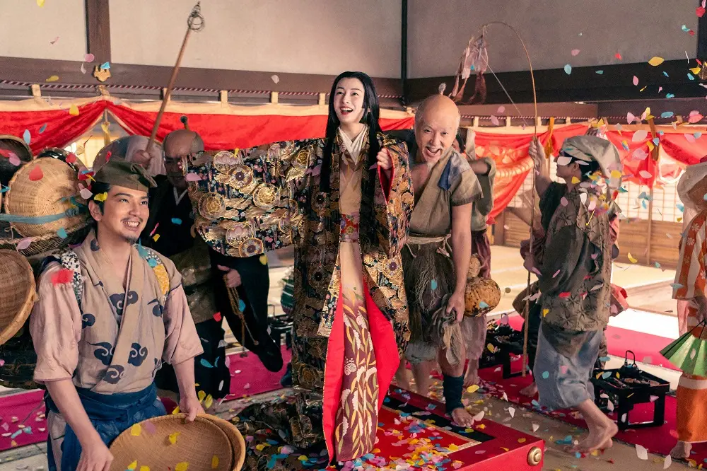 大河ドラマ「どうする家康」第38話。仮装大会“瓜畑遊び”を楽しむ(左から)徳川家康(松本潤)茶々(北川景子)豊臣秀吉(ムロツヨシ)(C)NHK