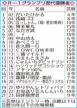 R―1グランプリ歴代優勝者 Photo by スポニチ 「R―1グランプリ」4年ぶり出場制限撤廃 芸歴10年以上も出場可能に、来年3… ギャラリーで見る この記事のフォト 2023年10月16日の画像一覧 もっと見る 2023年10月16日の画像をもっと見る