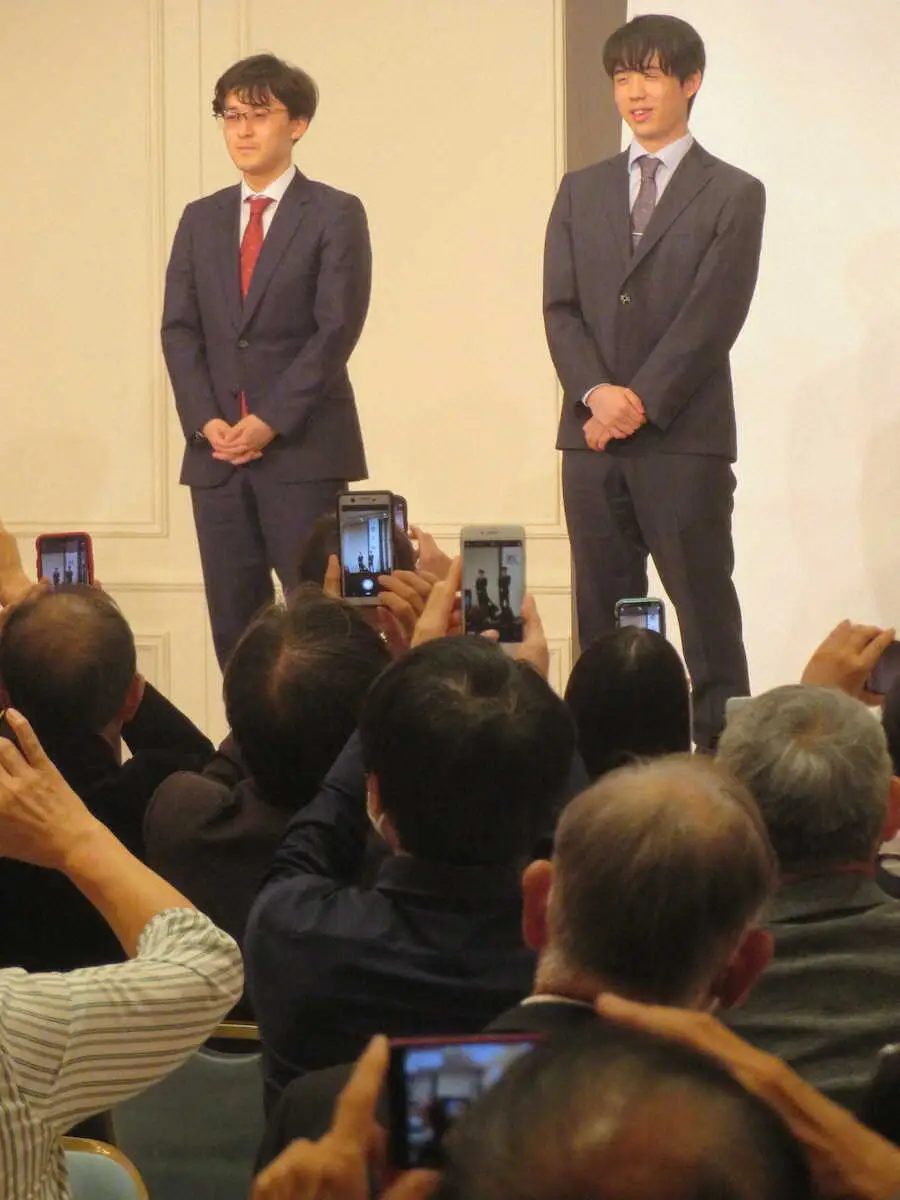 伊藤匠七段(左)と竜王戦第2局前夜祭に出席した藤井聡太王将