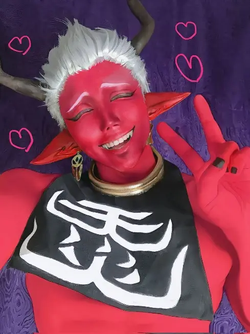 「全身が赤い肌のキャラなので最初赤い全身タイツを着ようと思っていたのですが、大柄な体格を出すためにマッスルパーツ+シリコン筋肉スーツを着用した上からの全身タイツは入らなかったので断念し、実際は顔だけメークで赤くしています。