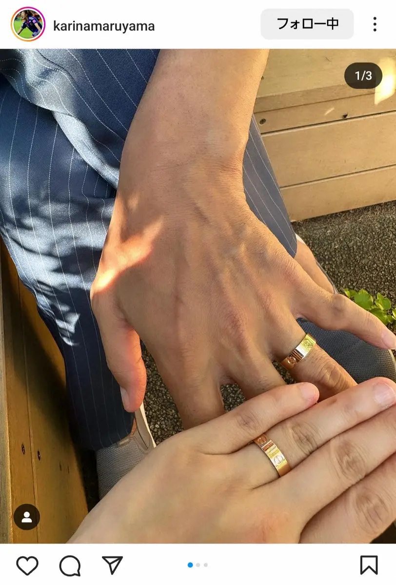 さらに「本並さんが今日はいい日だからと、指輪をプレゼントしてくれました」と報告。過去に出演したテレビ番組で結婚指輪を紛失したことを明かしていた丸山は「結婚指輪をなくしてからまた買ってもらい、結婚記念日を忘れた2人ではありますがペアリングです」と喜び「いつもありがとう」と感謝の言葉を記した。