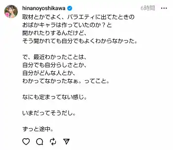 しかし、「最近わかったことは、自分でも自分らしさとか、自分がどんな人とか、わかってなかったなぁ。ってこと」とコメント。「なにも定まってない感じ。いまだってそうだし。ずっと途中」と模索中であることを告白した。