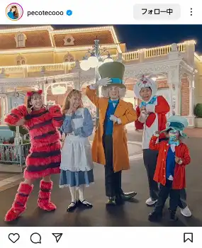 水色のワンピースとカチューシャでアリスに扮したpecoは、ディズニー好きで知られるチャンネル登録者数54万人のユーチューバー・あいにゃん夫婦、息子とともに、同作品に登場するキャラクター・マッドハッター(いかれ帽子屋)とのショットを公開。ハロウィーン期間は仮装での入園が可能で、「みんなで『不思議の国のアリス』になりきって!めちゃくちゃスペシャルなハロウィンの思い出ができました」と投稿した。