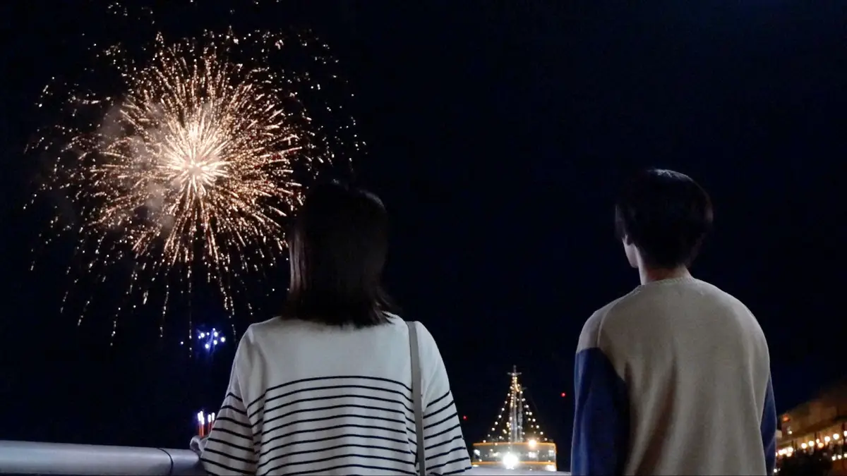 某日、撮影クルーは神戸港でスタンバイ。ところが当日は夕方から雨予報…。花火は無理か…。てるてる坊主も作って祈っていたところ、なんと奇跡的に夕方、雨が上がったのです。神戸の港に花火が打ちあがり無事に花火シーンを撮影できました。合成しない生の花火のリアリティは粋な風情があって素敵です。本編をぜひお楽しみに!!