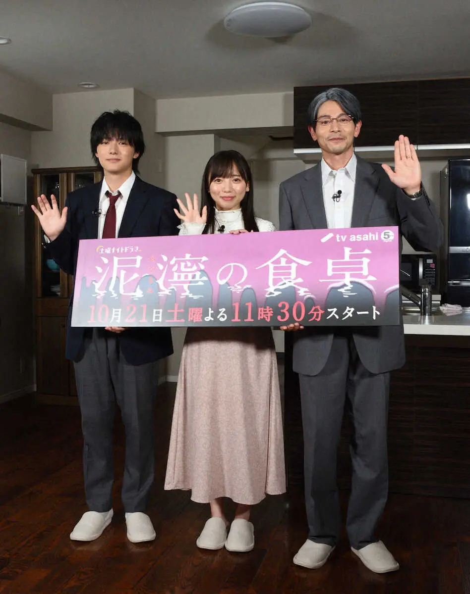 テレビ朝日ドラマ「泥濘の食卓」取材会に出席した(左から)櫻井海音、日向坂46齊藤京子、吉沢悠 (撮影・小田切 葉月)