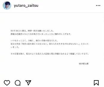CMは1997年に開始。竹本功一会長は本紙取材に「CMを断ることも多い方と聞いたが、快諾してくれてうれしかった。音楽が本当に好きな方だったので出てくれたのかな」と懐かしんだ。だが、なぜか不評で作り直すハメに。2日間スタジオを貸し切り、当時のCM撮影では珍しい映画用フィルムを用いて、振付師の香瑠鼓さん(66)を招いた。撮影時には孫で俳優の財津優太郎(24)が生まれたといい「終始にこやかで撮影に臨んでいました」と明かした。そのCMが8月末まで放送された。