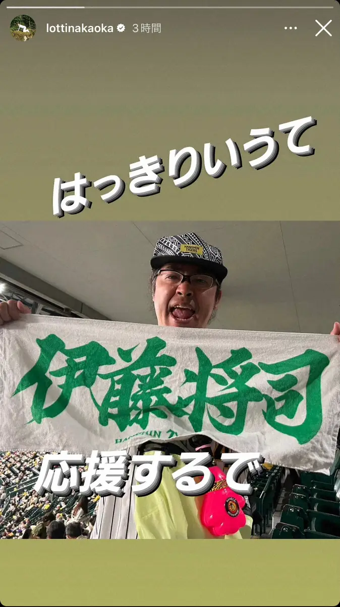 熱狂的な阪神ファンで知られる中岡は現地甲子園球場で試合を観戦。この日先発の伊藤将司のタオルを掲げた写真を添え、「はっきりいうて 応援するで」とつづった。