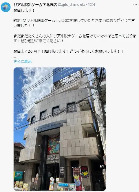 店舗公式も、SNSを通じ「閉店します!」と発表。「約8年間リアル脱出ゲーム下北沢店を愛していただき本当にありがとうございました!!まだまだたくさんの人にリアル脱出ゲームを届けていければと思っております!ぜひ遊びに来てください!閉店まで2ヶ月半!駆け抜けます!どうぞよろしくお願いします!!」と記した。