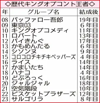 コント日本一を決める「キングオブコント2023」の決勝が21日、TBSで生放送され、赤羽健壱(44)と児玉智洋(43)のコンビ「サルゴリラ」が16代目王者に輝いた。大会史上最多の参加者3036組の頂点に立ち、賞金1000万円を手にした。
