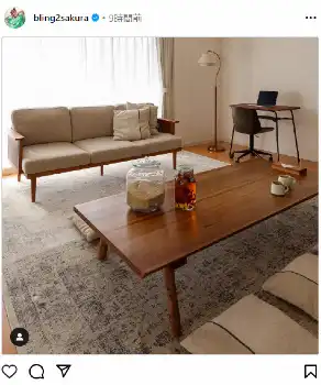 お気に入りの家具で構成された部屋の画像をアップ。「実家の父からもらったヤマザクラの木でできたテーブル、武蔵小山の骨董屋さんで購入した勉強机、憧れのソファとラグ生活」と説明した。