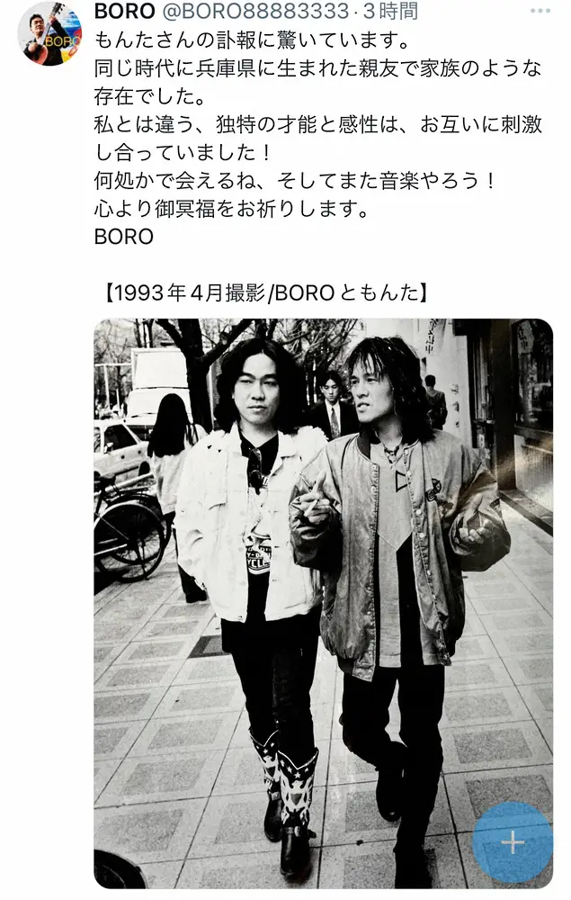 BOROはこの日、自身のXでも追悼投稿。1993年4月に撮影したもんたさんとのツーショットとともに、「何処かで会えるね、そしてまた音楽やろう!」とつづった。