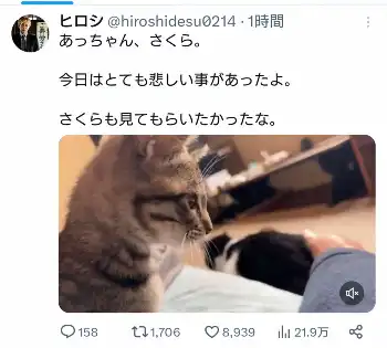 ヒロシは、櫻井さんの名前から名付けた2匹の愛猫との動画と投稿し「あっちゃん、さくら。今日はとても悲しい事があったよ。さくらも見てもらいたかったな」とつづったもの。
