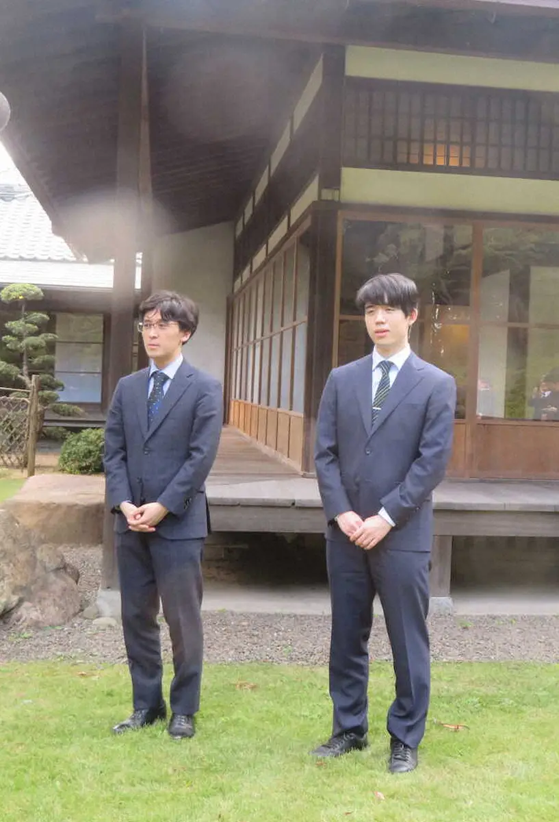 竜王戦第3局の対局場、旧安川邸での前日検分前に記念撮影に臨んだ藤井聡太竜王(右)と伊藤匠七段