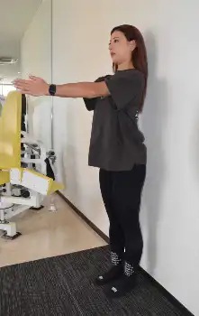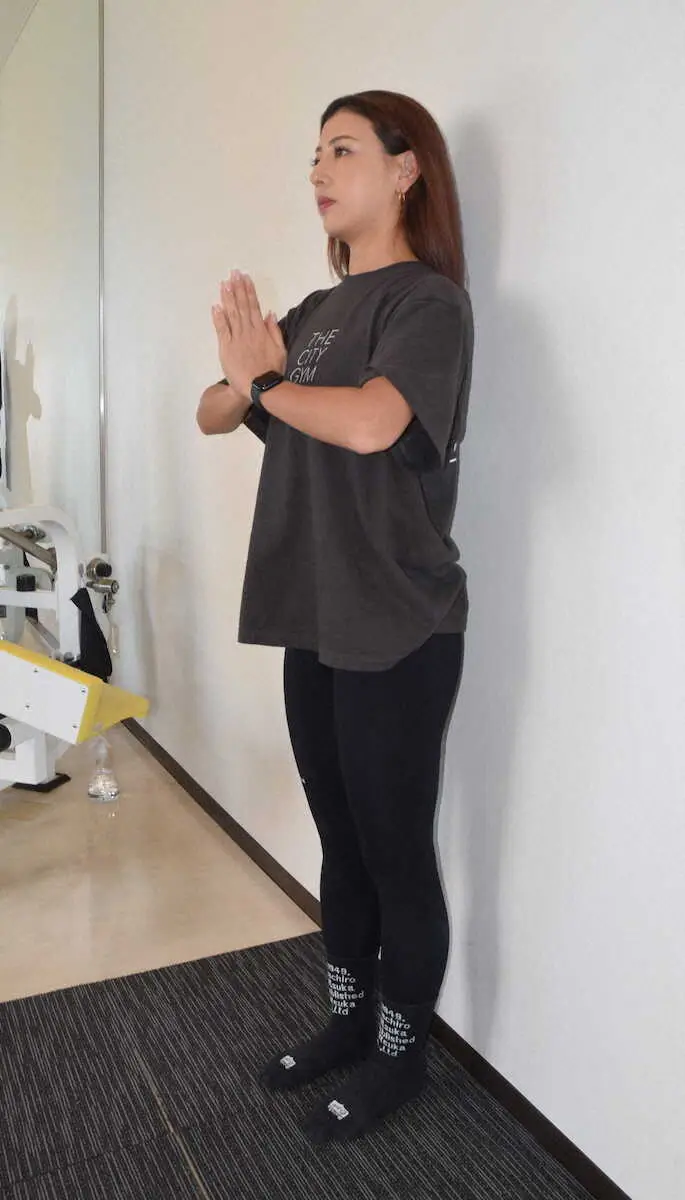 注意点は両手を押し合う際に背中を丸めないこと。どうしても丸まってしまう人は壁に背中をつけて、頭からかかとまでを一直線にすることを意識するといいですよ。そんなに負荷は大きくない手軽なメニューなので、20回2セットぐらいがいいでしょう。