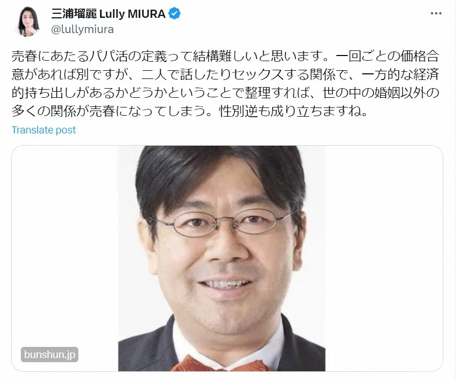 三浦氏は、山田氏の辞任について「売春にあたるパパ活の定義って結構難しいと思います」とし、その理由について「一回ごとの価格合意があれば別ですが、二人で話したりセックスする関係で、一方的な経済的持ち出しがあるかどうかということで整理すれば、世の中の婚姻以外の多くの関係が売春になってしまう。性別逆も成り立ちますね」と私見をつづった。