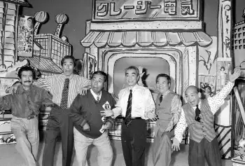 1991年6月、テレビ番組に出演したクレージーキャッツのメンバー。(左から)安田伸さん、犬塚弘さん、ハナ肇さん、植木等さん、谷啓さん、桜井センリさん=東京・赤坂