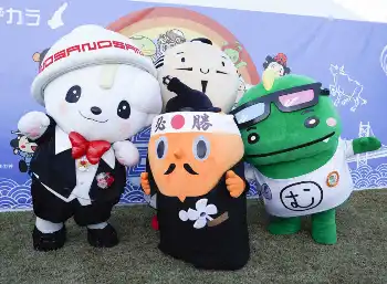 <ゆるバース2023>ゆるバースで1位となった本場さぬきうどん協同組合・公認うどん大使ツルきゃら、うどん脳(中央)2位となった泉佐野市公式キャラクター・ゆるナキン(左)、3位となった越後柏崎のPRキャラクター・えちゴン(右)(撮影・中辻 颯太)
