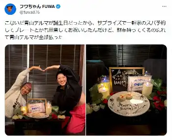フワちゃんのX(@fuwa876)より 左から青山テルマ、フワちゃん フワちゃん 親友・青山テルマの誕生日サプライズで大失態!「スパ予約し… ギャラリーで見る この記事のフォト 2023年11月01日の画像一覧 もっと見る 2023年11月01日の画像をもっと見る