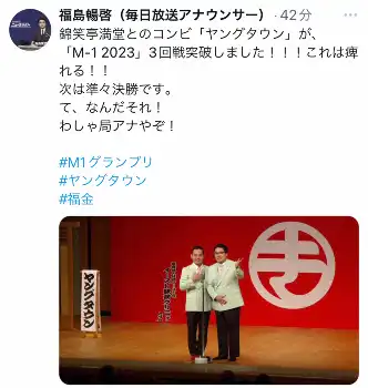 MBS・福島暢啓アナウンサーのX(@jingtangK)より MBS福島アナがM-1準々決勝へ!錦笑亭満堂とのコンビ3回戦突破に「痺れる… ギャラリーで見る この記事のフォト 2023年11月01日の画像一覧 もっと見る 2023年11月01日の画像をもっと見る